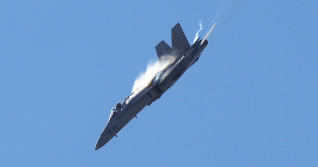 Entretanto otro EF-18M en configuración “limpia” (sin cargas ni